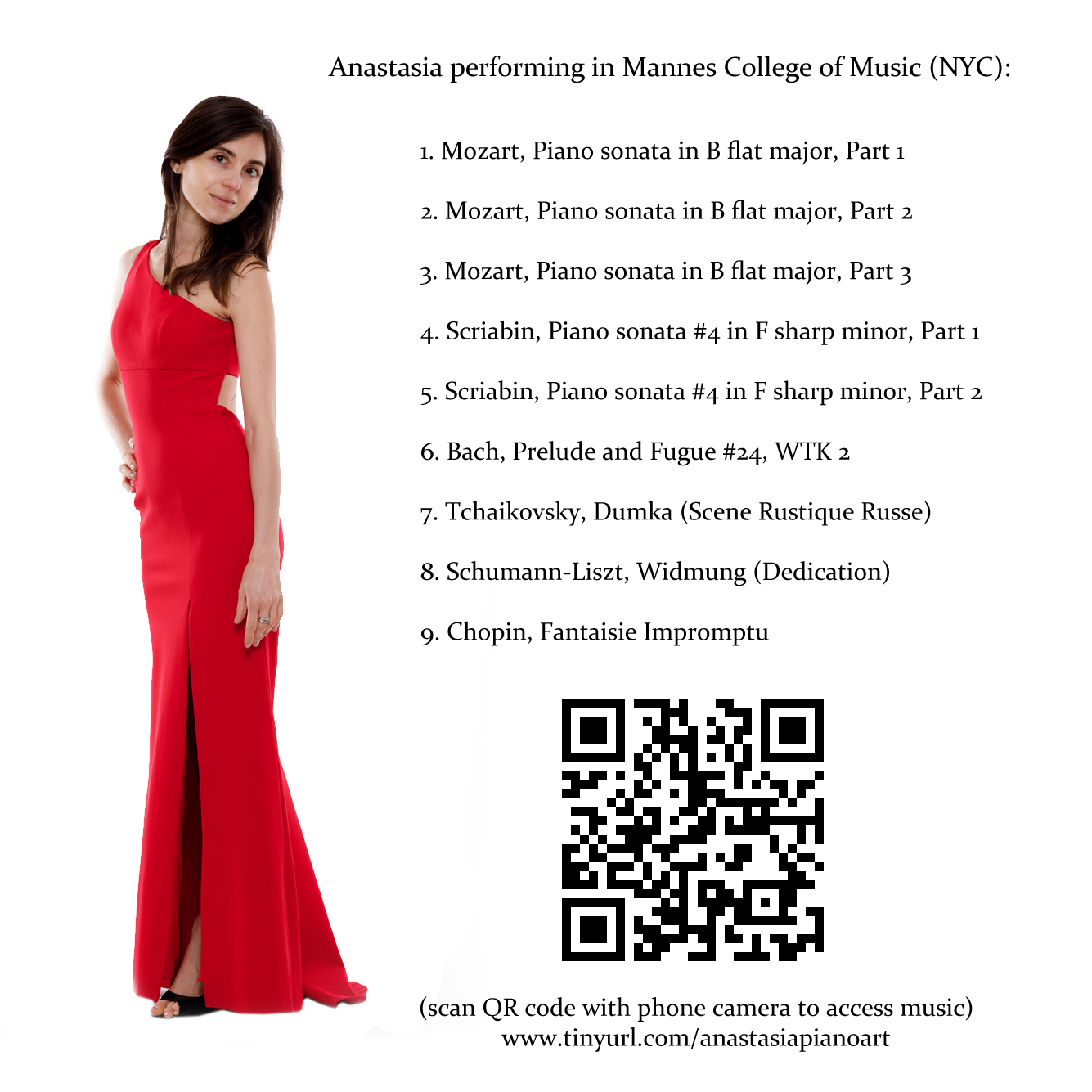 Anastasia was particularly inspired by the art of pianist Vladimir Horowitz and by the British cellist Jacqueliene Du Pre. Among her favorite composers are Chopin, Schumann, Brahms, Bach, Mozart and Mahler. She is also fascinated by the music of Russian composers-- Sergey Rachmaninov, Alexander Scriabin , Pyotr Ilyich Tchaikovsky and Rimsky-Korsakov.